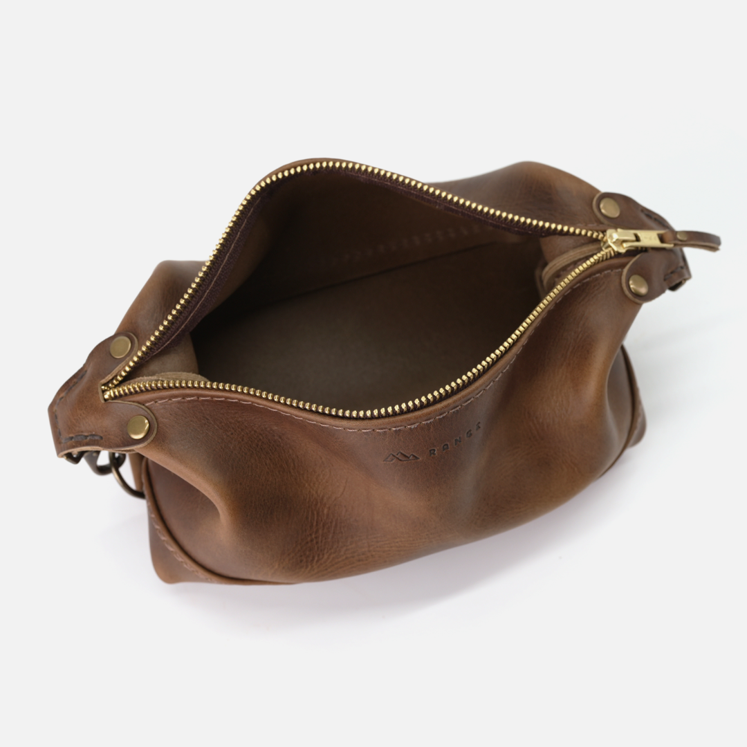 Cut from full-grain Horween leather and crafted in our Laramie shop, the Hubbard Traveler carries the things that keep you moving—razor, brush, cologne, charger, a few miles of road dust. The wide-zip top opens flat for easy reach, while the sturdy base keeps it upright on uneven ground. Inside, every mark and scuff will tell where you’ve been, not what you’ve lost.